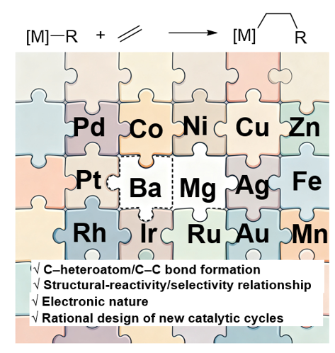 Main-group catalysis is rapidly reshaping the landscape of modern catalysis, yet a detailed understanding of how s-block metals orchestrate complex bond transformations remains limited. Here, we present a comprehensive in silico exploration of alkene and alkyne functionalization catalyzed by organomagnesium(II) and organobarium(II) complexes. Through density functional theory (DFT) and orbital interaction analyses, we reveal how metal identity, migrating group, ligand environment, additives, and substrate structure collectively govern the thermodynamics, kinetics, and regioselectivity of s-block metal–element bond migratory insertions. Two distinct reactivity regimes emerge: Mg(II) engages in orbital coupling and back-donation, whereas Ba(II) behaves as a nearly pure nucleophilic center with minimal metal–carbon coupling. For heavier alkaline-earth metals, dimerization acts as a reactivity bottleneck that can be alleviated through crown ether–type or multidentate ligands. Remarkably, Mg(II) and Ba(II) exhibit complementary chemoselectivity: Mg(II) enables C–heteroatom coupling, whereas Ba(II) enables C–C bond formation. Guided by these mechanistic insights, we propose seven catalytic blueprints encompassing Mg(II)-catalyzed anti-Markovnikov alkoxylation, alkylthiolation, enol ester formation, and epoxide polymerization, as well as Ba(II)-catalyzed cross coupling, arylsilylation, and cascade [2+1] cyclopropanol synthesis. Together, these results establish a unified conceptual framework for s-block reactivity and offer new principles for designing sustainable catalysis using earth-abundant, non-redox metals.